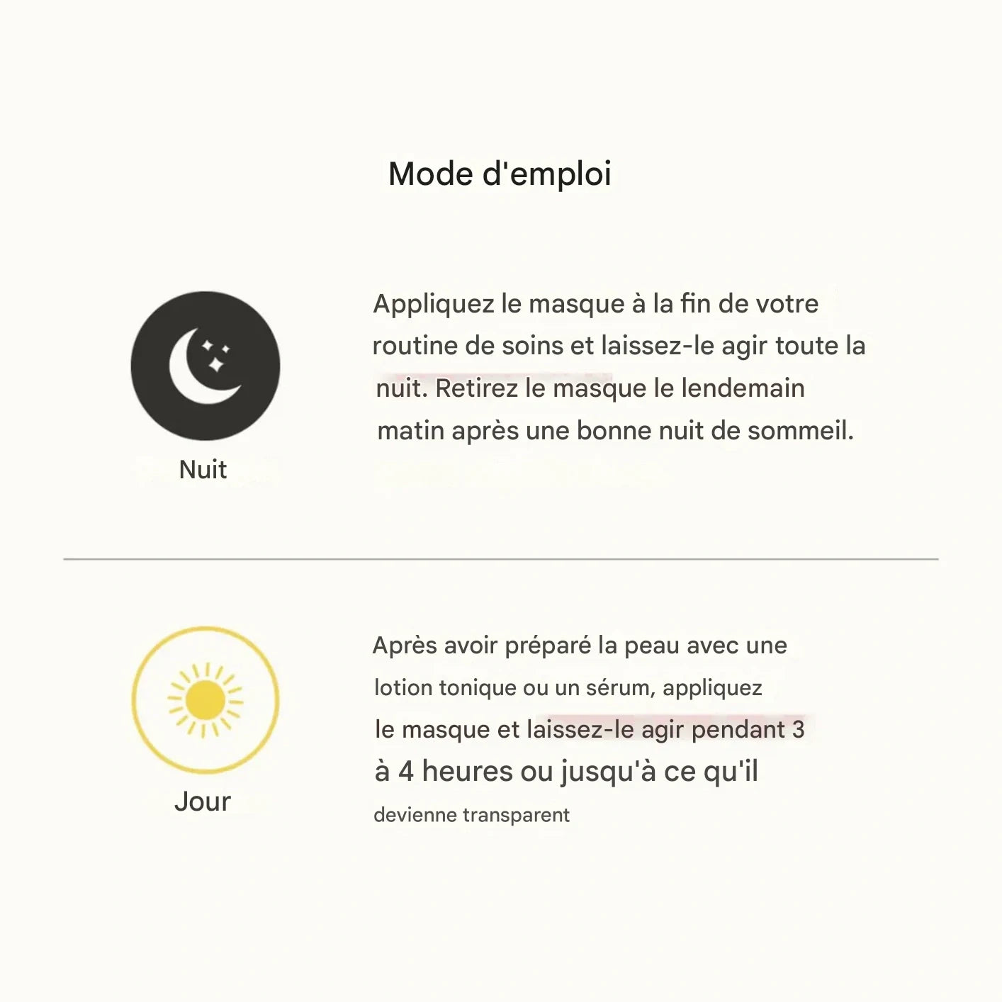 Pour de meilleurs résultats, nous recommandons d'utiliser le masque 1 à 2 fois par semaine ou chaque fois que votre peau a besoin d'un regain d'hydratation.