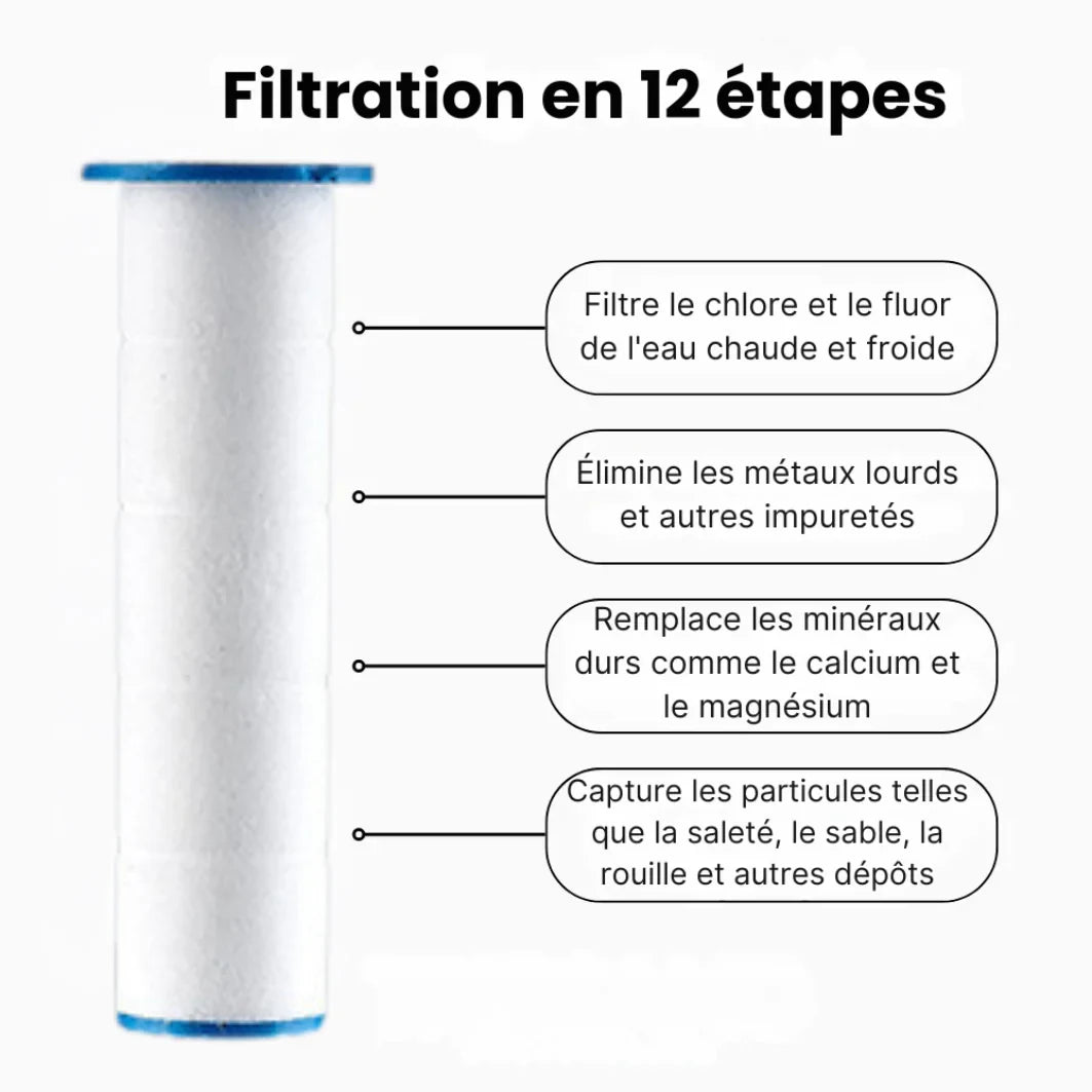 Le filtre élimine le chlore, le calcaire et les autres impuretés de l'eau du robinet afin de protéger la peau et les cheveux et de garantir une meilleure expérience de la douche.