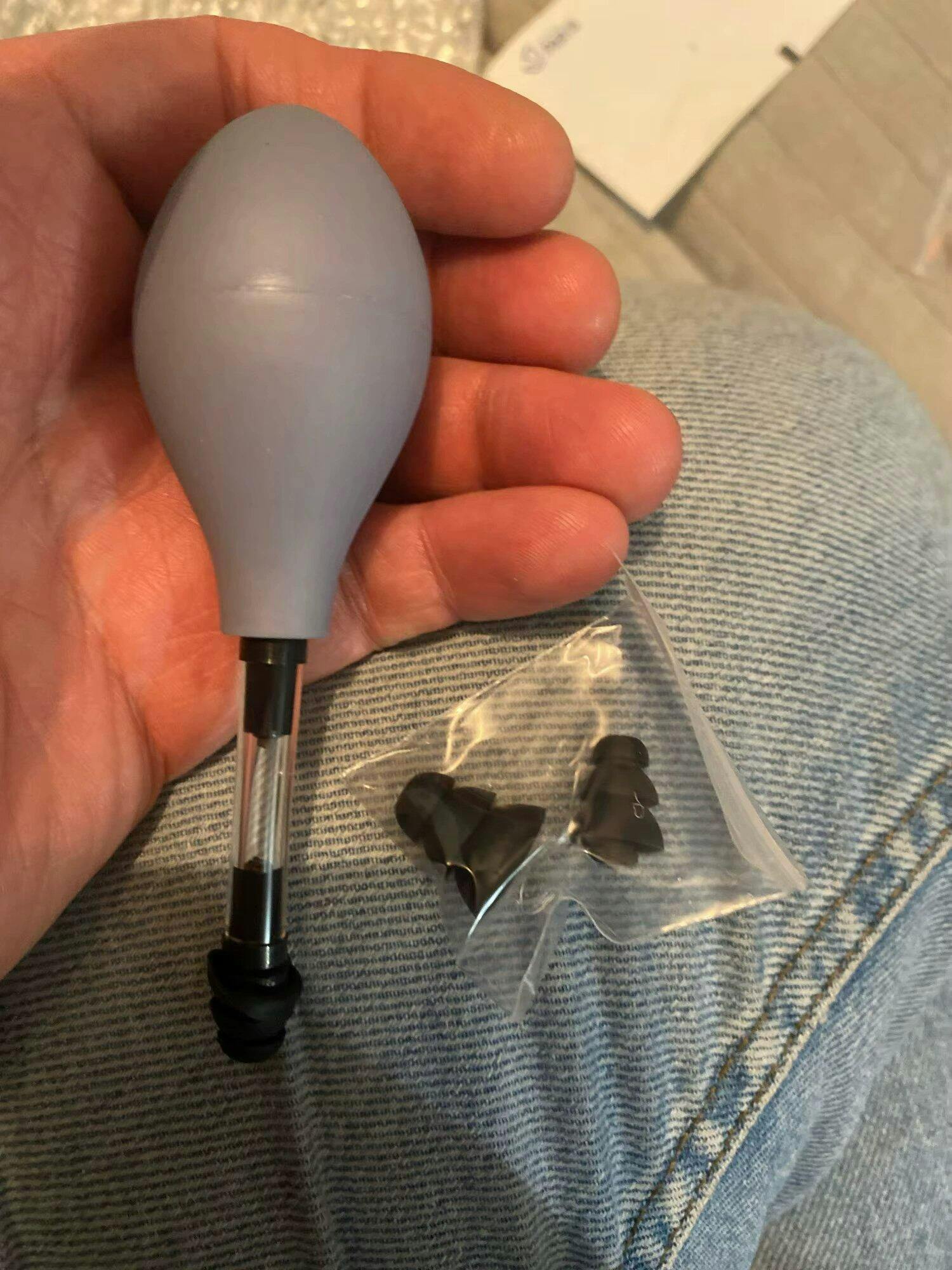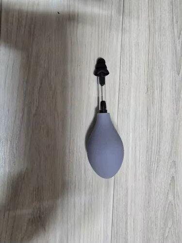 Pressez légèrement la poire 5 à 10 fois, de manière rythmée, sans la vider complètement. Cette stimulation douce génère une légère pression apaisante dans l’oreille.
