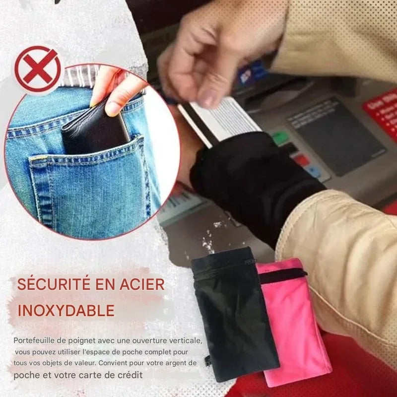 Très apprécié des grands voyageurs d'aujourd'hui. Voyagez léger, protégez-vous des pickpockets et protégez vos objets de valeur avec notre portefeuille de poignet. Idéal pour ranger espèces, cartes de crédit et pièces d'identité.